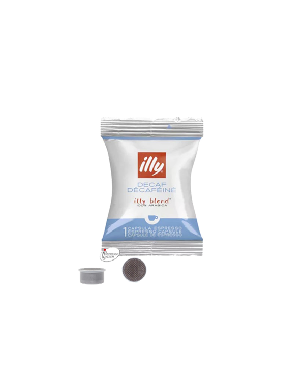 Capsula illy de descafeinado, que mantiene inados el sabor y el aroma típicos del tueste medio, con un porcentaje de cafeína inferior al 0,05%, la mitad de lo que prevé la ley para los descafeinados